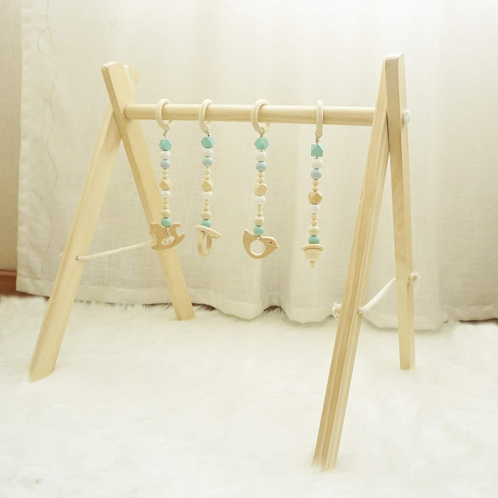 Baby Play Gym, Wooden Baby Gym with 4 Infant Toys, Foldable Wood Gyms Frame Hanging Bar for Toddler, Newborn, Baby Girls and Boys Shower Gift Play Toys