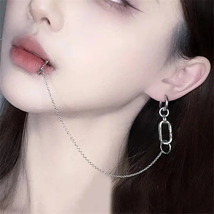 Looking for a unique and edgy accessory to add to your outfit? Look no further than our Cool Style Fake Piercing Lip Clip Earring. These punk chain linked earrings are sure to make a statement and elevate your style.