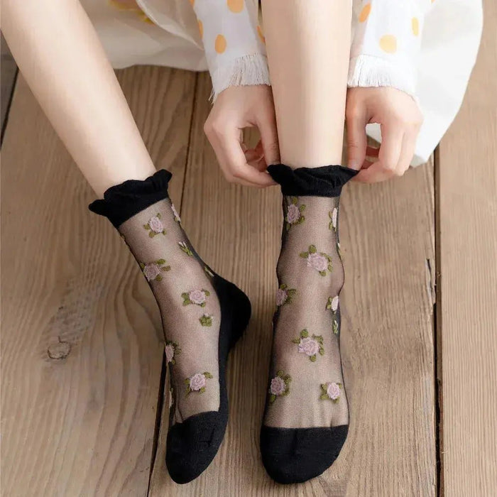 Vintage Floral Lace Ruffle Socks for Women - Kawaii Harajuku Style Ultra-thin Transparent Crystal Silk Crew Socks